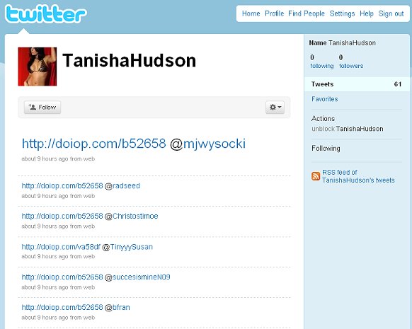 It's completely automated (just scan for Twitter handles and post your tweet), easy to scale (you can set up new accounts faster than Twitter can shut you down) and you don't need anyone to follow you. And with shortened URLs, it's hard to know where you're going until you land -- nearly guaranteed traffic generation.