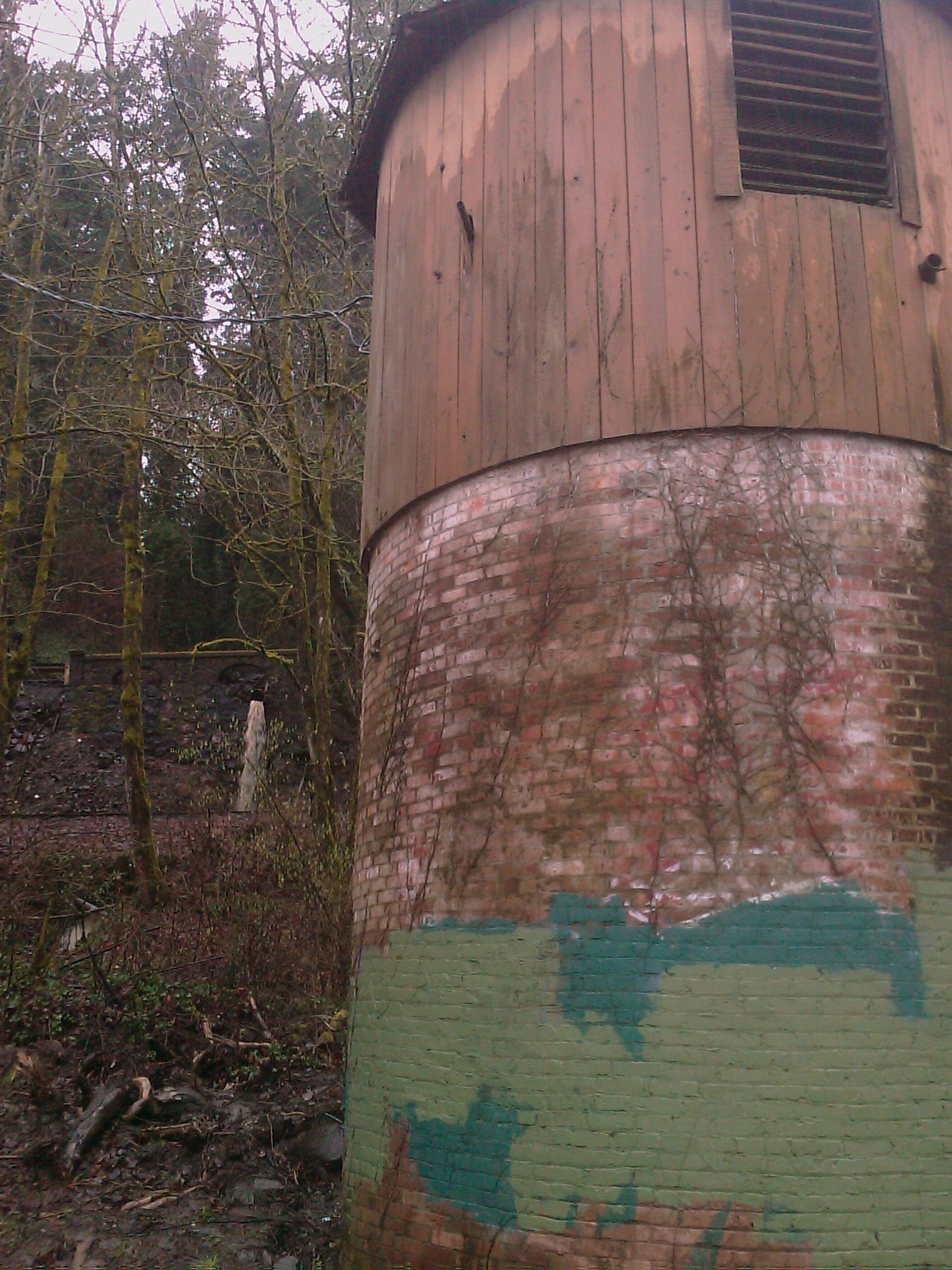 And I always seem to find something interesting hidden away in the places away from the sidewalks and motorways. Yesterday it was this tower that I assume is an old pumping station on the Willamette River. It still has power, and looks moderately maintained, but it has the look of a 19th century version of a medieval turret. The muddy water shooting out the pipe in the distance made me think of Willy Wonka's chocolate river, and with everything muffled by the sound of rain and water, it was one of those surreal moments that I love to find in Portland.