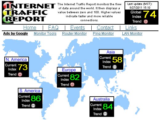 I almost hate to admit watching the Weather Channel during Hurricane Irene. Being in Portland, Oregon, makes it seem more like watching SyFy Channel -- surreal and impersonal entertainment, except it's real. So, to keep it real for myself, I checked out The Internet Traffic Report.