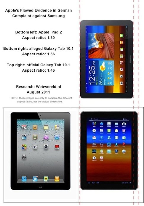 And seeing is believing. Apple's team submitted the photo and some damning numbers -- the Galaxy Tab was shown to have a 1.36 aspect ratio, ever so close to the 1.30 ratio of the iPad.
