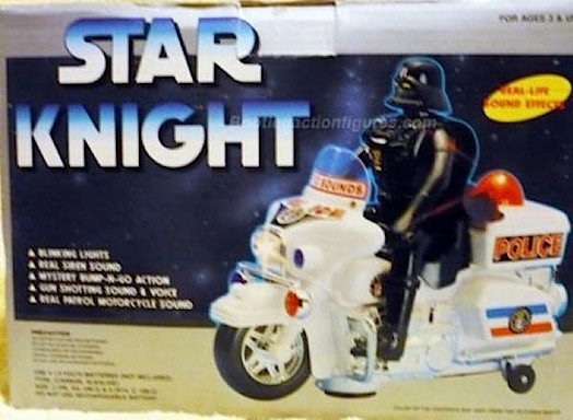 From the classic word of George Lucas, and the less classy world of Chinese knock-offs we bring you 'Star Knight' -- Darth Vader patrolling the streets with Ponch and John for the good of the Empire.
