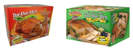 After some research I found images of both Tony Chachere's and Big Easy's Tur-Duc-Hen packaging. (If you can come up with better images, please send them along…) The main complaint seems to be in the use of the ribbon but, overall, that Big Easy just lifted the main elements and then changed the background color.