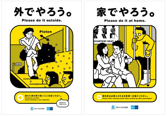 They have little phrases in English like “Please do it outside' with a picture of someone shaking off their umbrella, or “Please do it at home' for the couple lounging on the subway seats while poor Mr. Manners is stuck standing on his broken leg. Mr. and Mrs. Manners are obviously made very uncomfortable by the rude
