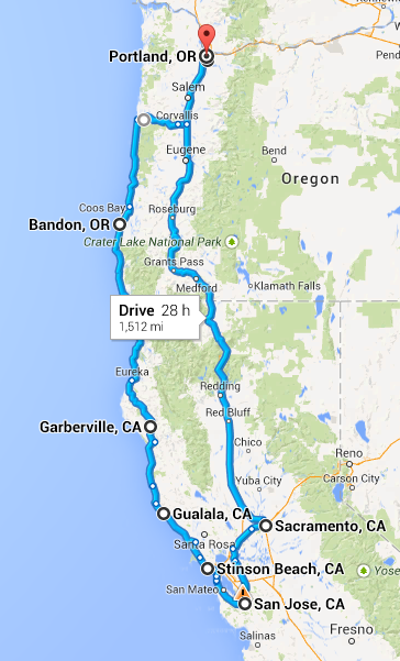 So, rather than taking the 1 1/2 hour flight from Portland to San Jose last week, I took three days to drive down the coast. I was able to visit my dad in Bandon, see the old alma mater in Arcata, sleep in the redwoods, visit the old vacation house I grew up with in the Sea Ranch, spontaneously get together with friends at Fort Ross.