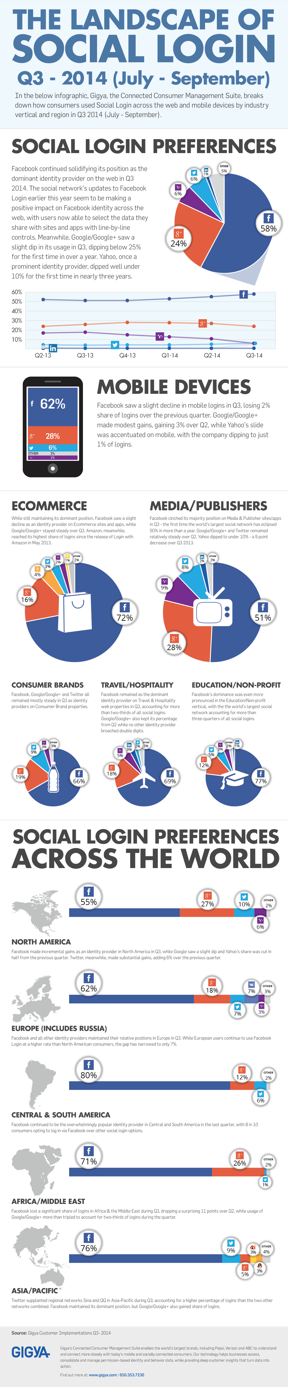 Well, the folks at Gigya did a bit of research and this is what they came up with. Facebook by far helps more people log into some other service or app more than anyone else, which is cool because it's only one password, but kinda scary if you're worried about Facebook knowing too much about you, because this just expands their footprint a little further than where you post pictures of cats jumping into boxes…